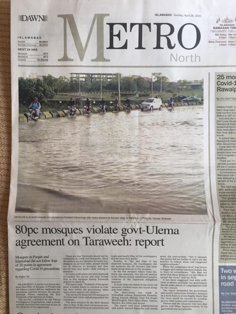 26 April 2020, Dawn News, “80% Mosques Violate Govt-Ulema Agreement on Taraweeh-Report by Pattan”