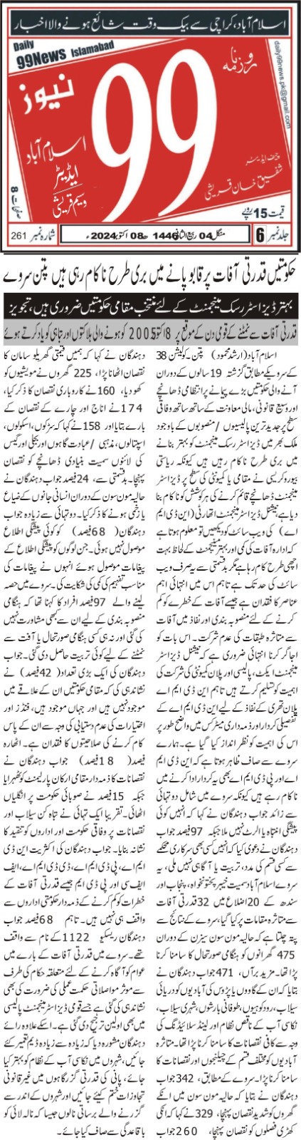 8 October 2024, Daily 99 News Islamabad, Govt fails to improve disaster risk management