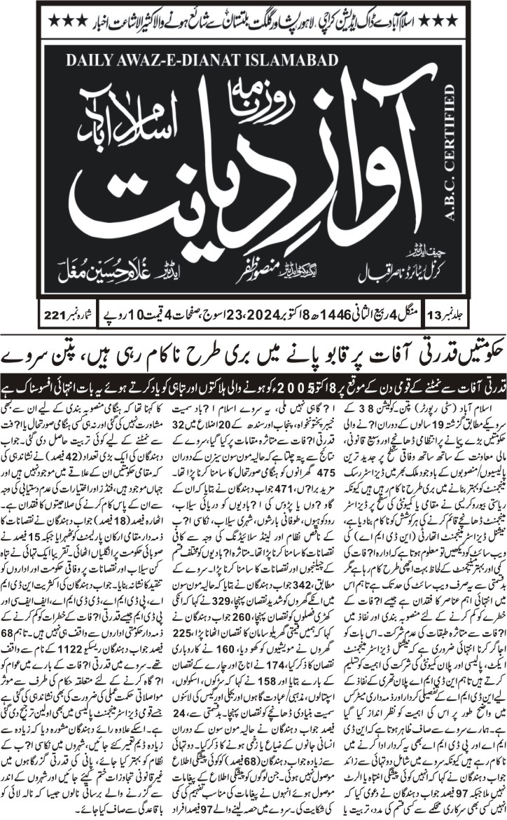 8 October 2024, Daily Awaz-e-Dianat Islamabad, Govt fails to improve disaster risk management