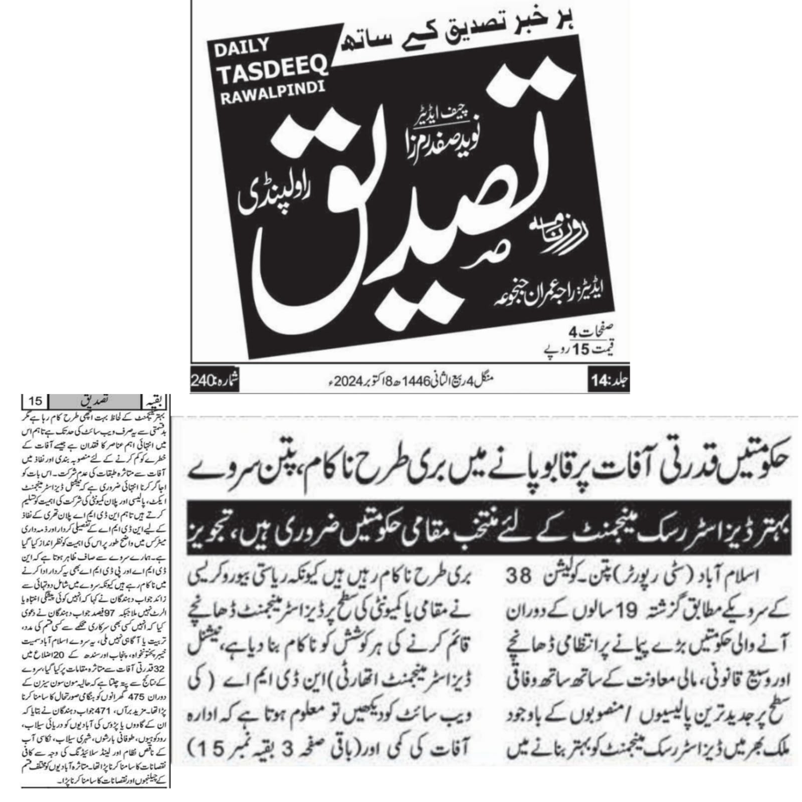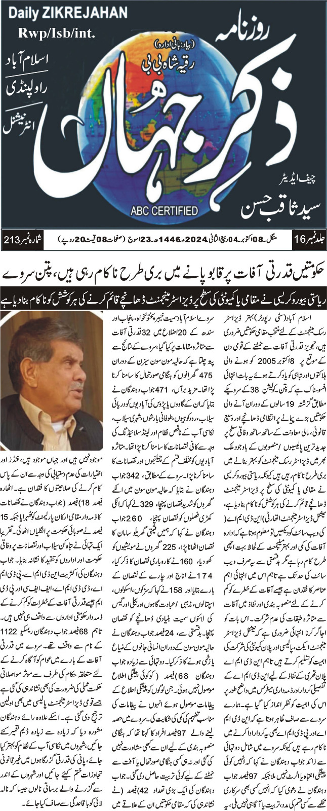 8 October 2024, Daily Tasdeeq Rawalpindi, Govt fails to improve disaster risk management