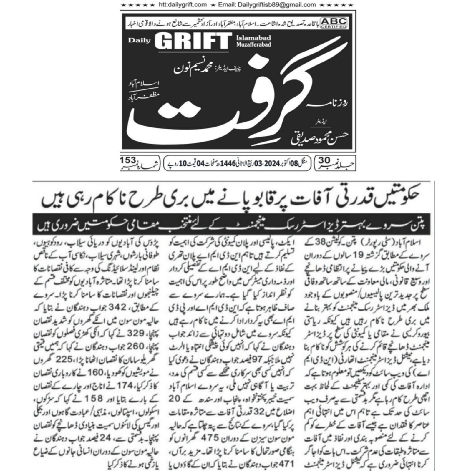 8 October 2024, Daily Grift Islamabad, Govt fails to improve disaster risk management