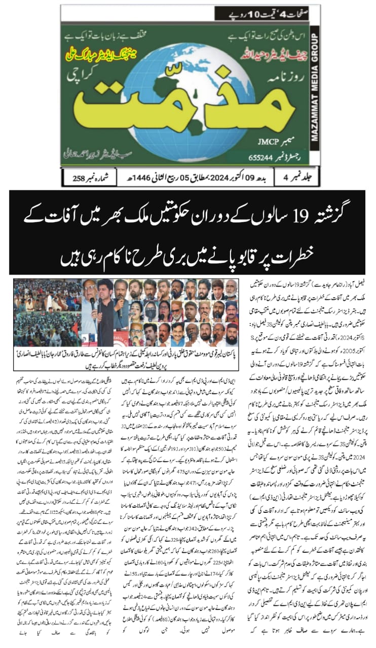 8 October 2024, Daily Muzamat Karachi, Govt fails to improve disaster risk management