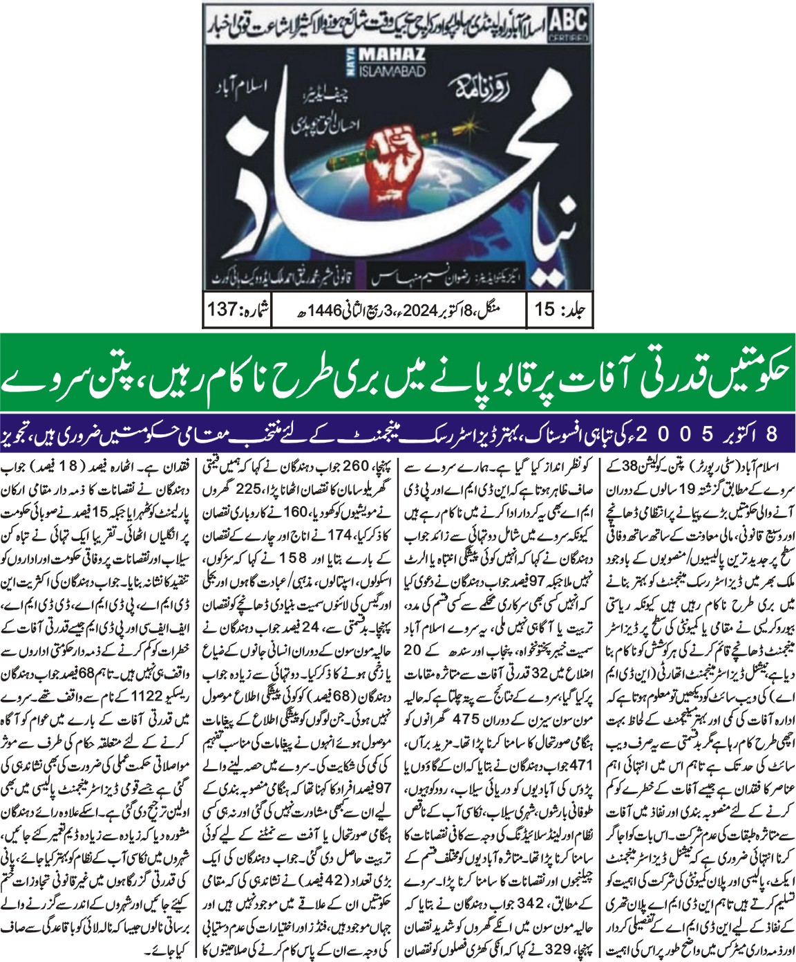 8 October 2024, Daily Naya Mahaz Islamabad, Govt fails to improve disaster risk management