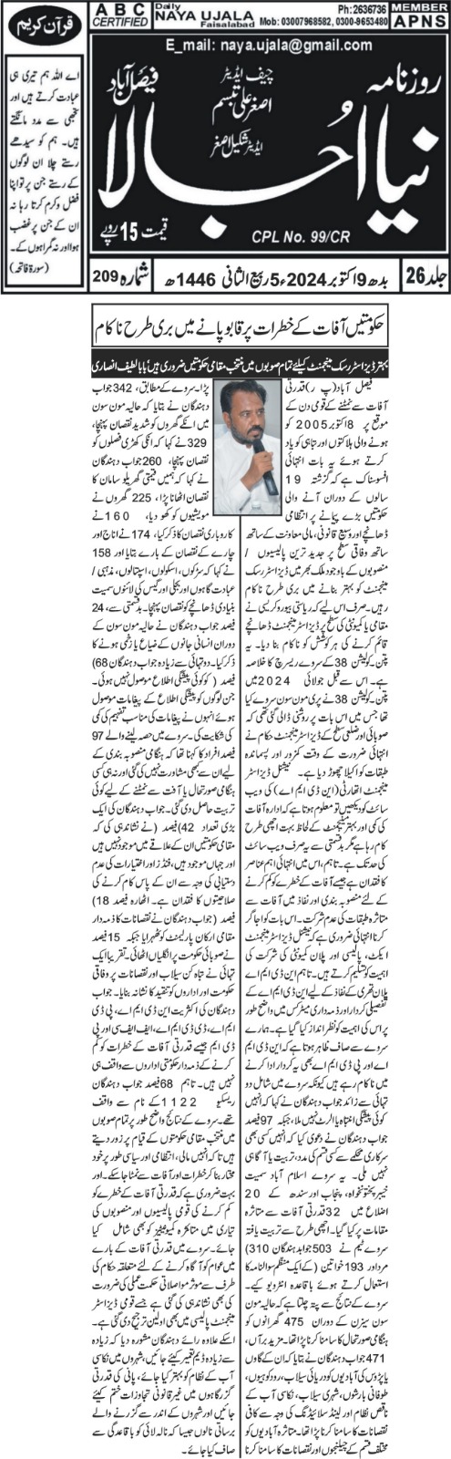 8 October 2024, Daily Naya Ujala Faisalabad, Govt fails to improve disaster risk management