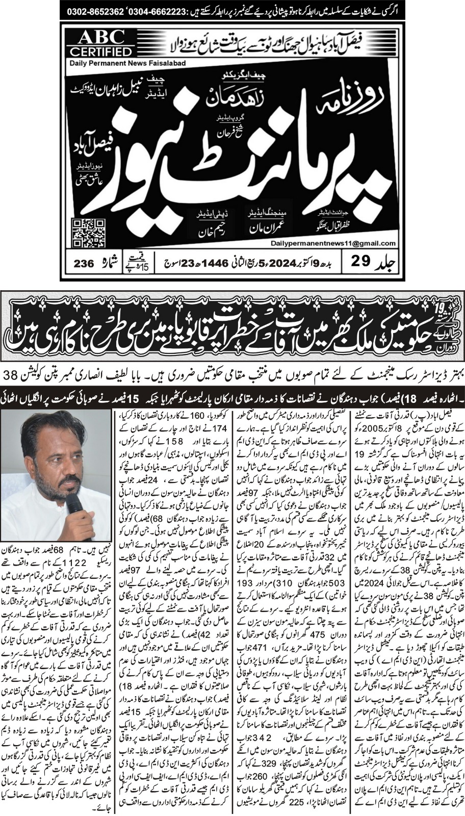 8 October 2024, Daily Permanent News Faisalabad, Govt fails to improve disaster risk management